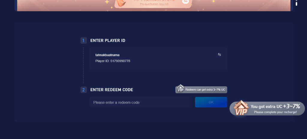 - Confirm Redemption: After entering your ID and code, click the confirmation button to redeem the UC.